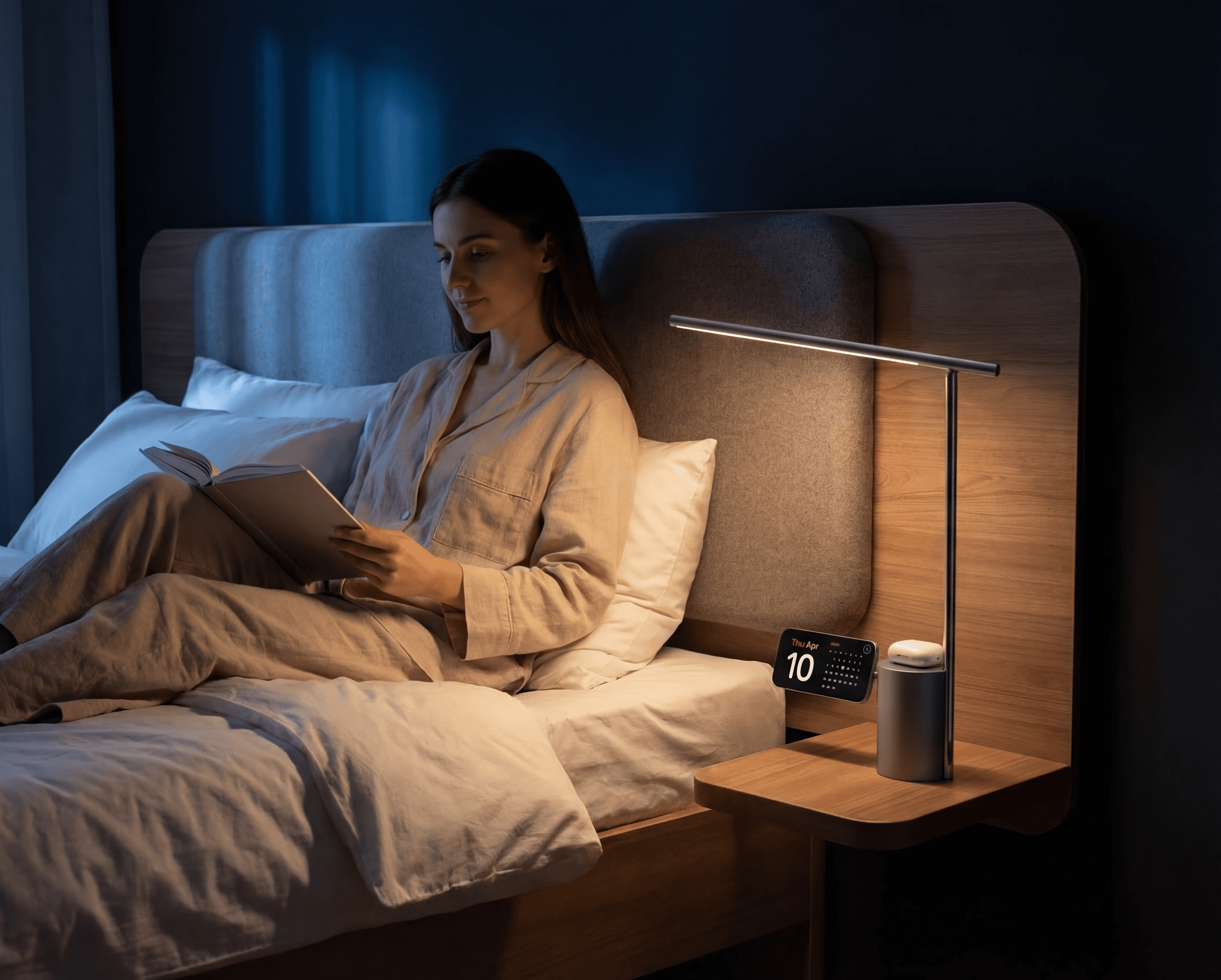 Warm, ambient light for reading, relaxing music, or a late-night call. End the day with everything charged and your space set for rest.