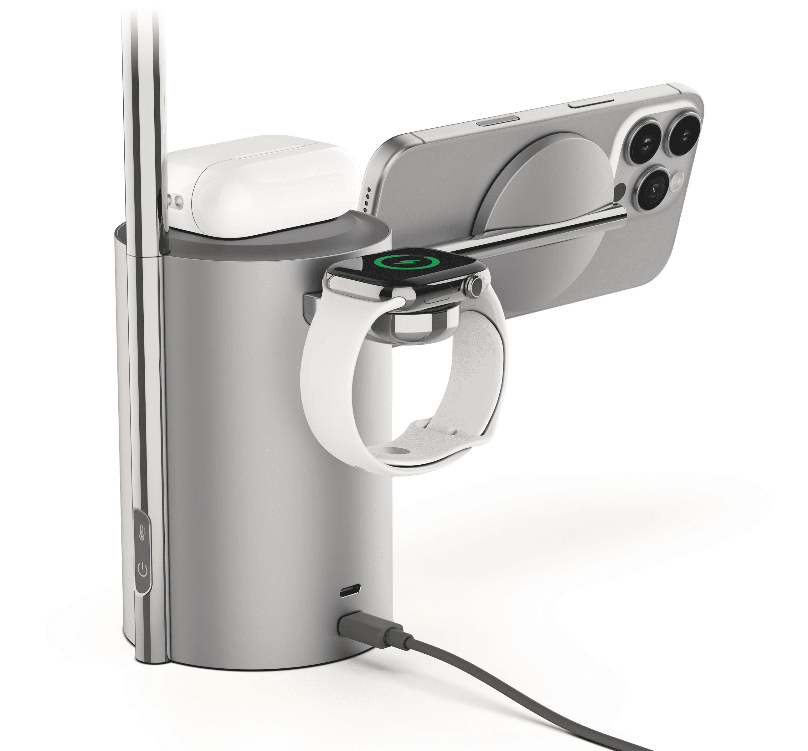 Yes! The integrated dual charging system allows you to charge both your iPhone and AirPods simultaneously, keeping your essential devices powered while you prepare, work, or create.